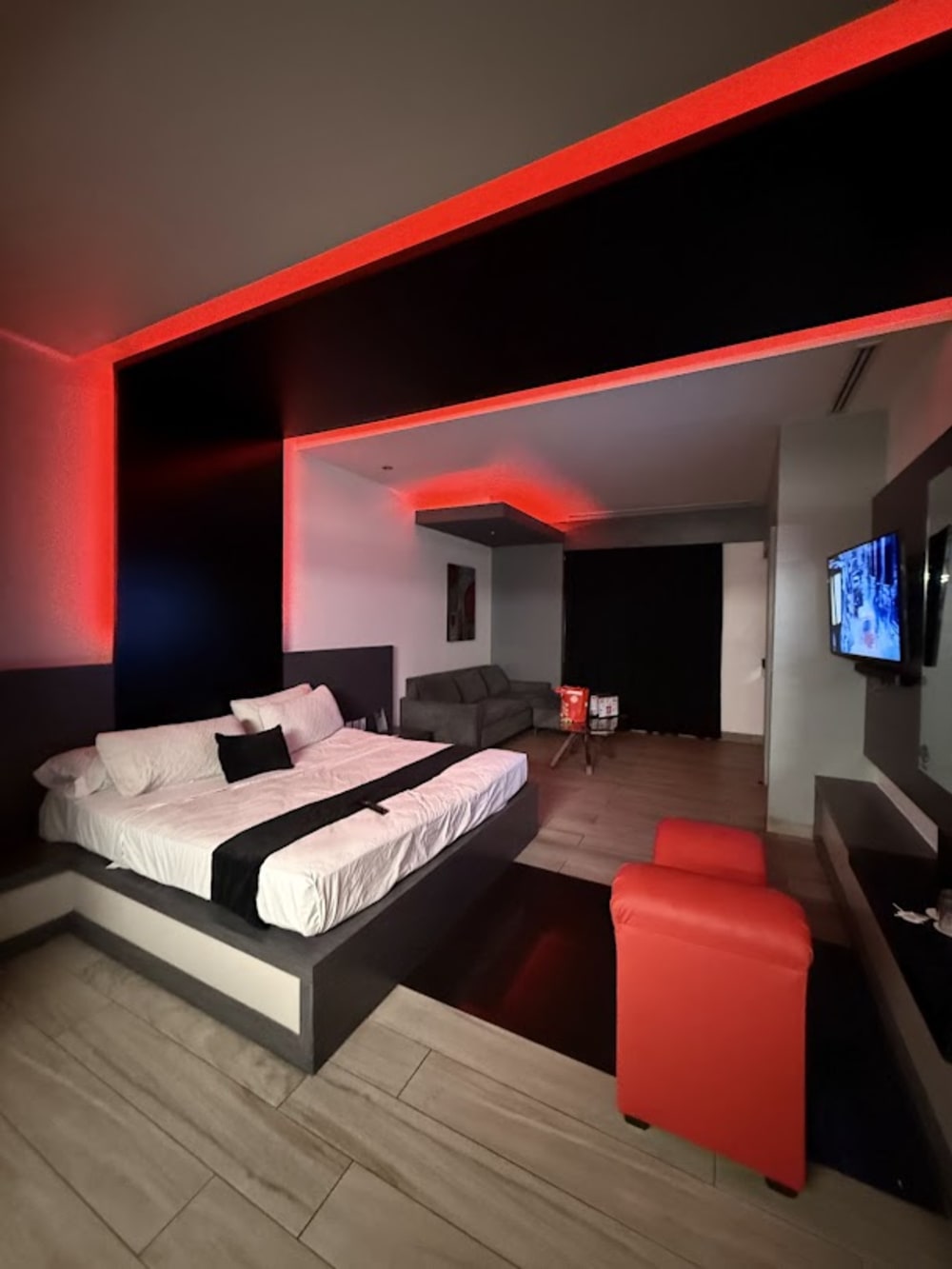 Relájate en nuestro amplio jacuzzi para dos personas con TV enfrente. Esta suite cuenta con un «potro del amor» y un sofá tipo sala para momentos especiales. Estancia: Lunes a Jueves: 12 Hrs / Viernes a Domingo: 6 Hrs.